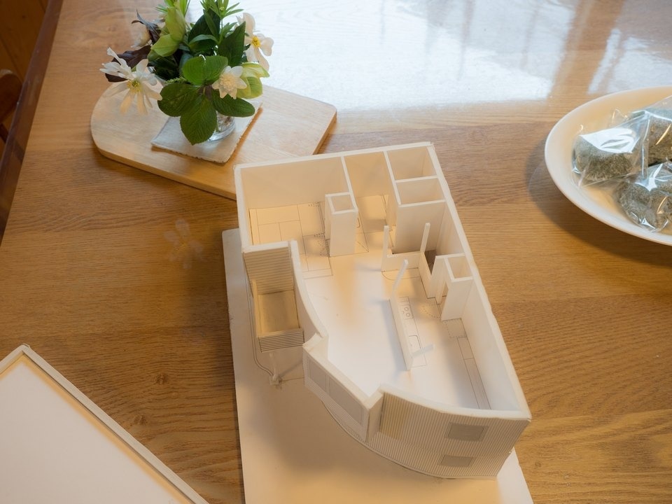 通りからはオーソドックスな箱型に見えるS邸ですが、日中の日差しを効率良く取り込むため、南東側全面に丸みを持たせた2階リビングの家。奥様が新築の記念に保管していた住宅模型を上から見ると、扇形に近い形をしています。