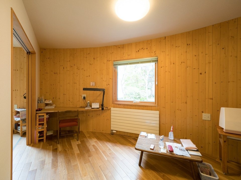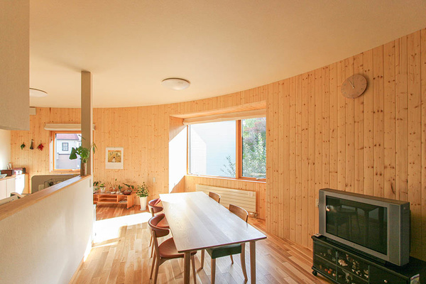 緩やかなカーブを描いた壁面に下川町産トドマツの羽目板を贅沢に使った日当たり満点な2階リビング。Sさんご自身が「余計な物は持たない」というライフスタイルを貫いていることから新築時と同様、最小限の家具だけが置かれています。フローリングは道産のナラ材。