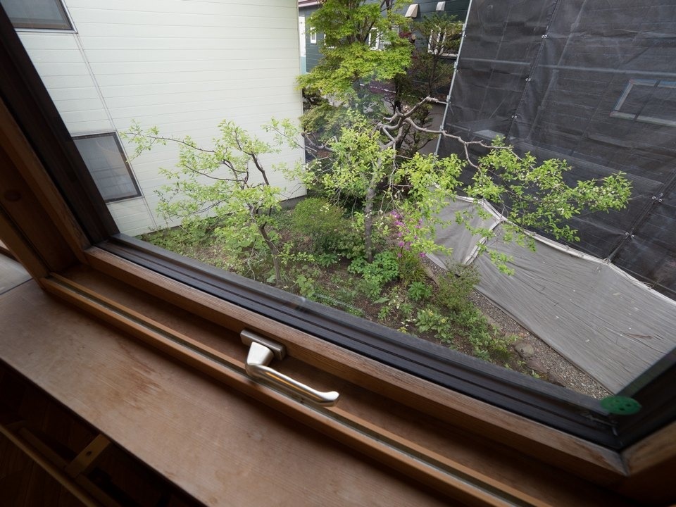お隣のモミジが顔をのぞかせるリビングの出窓。「住宅密集地にわずかに残る緑を借景に生かすため、モミジが見える位置に開放感のある出窓を設けました(奈良さん)」。視線を下に移すと、奥様が丹精込めたお庭が見えます。窓の横にお孫さんの背くらべの跡が。