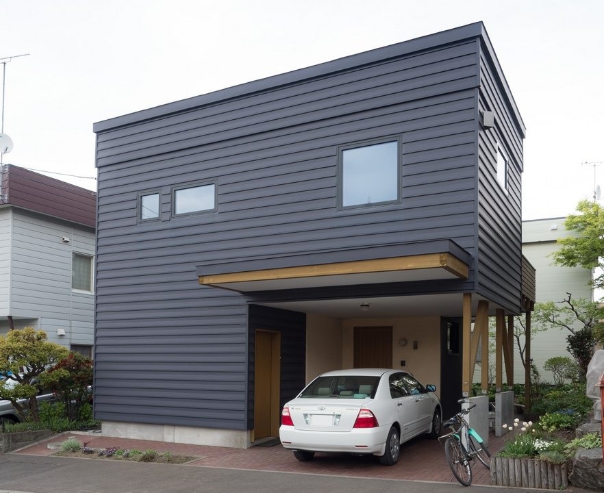 3方を住宅に囲まれた西向きの土地に建つS邸。流行に左右されない落ち着いた色使いのシンプルなお住まいです。玄関廻りの木製の建具やビルトインカーポートはお手入れが行き届き、築10年とは思えないほどキレイ!