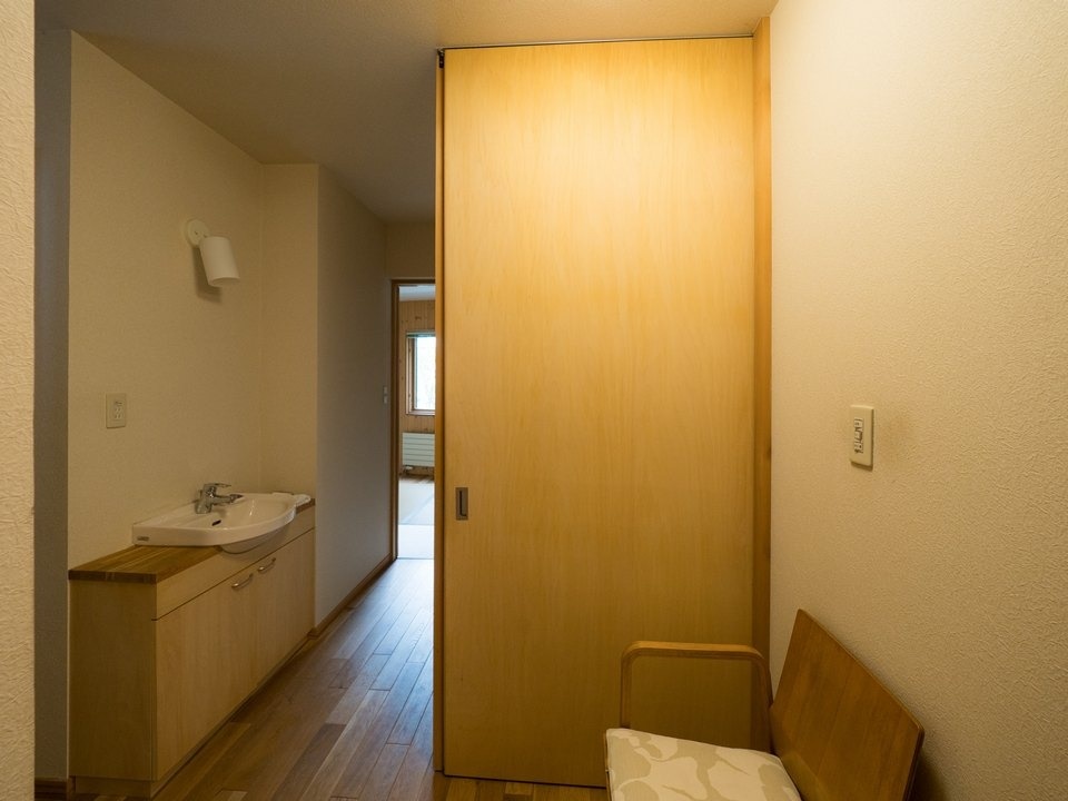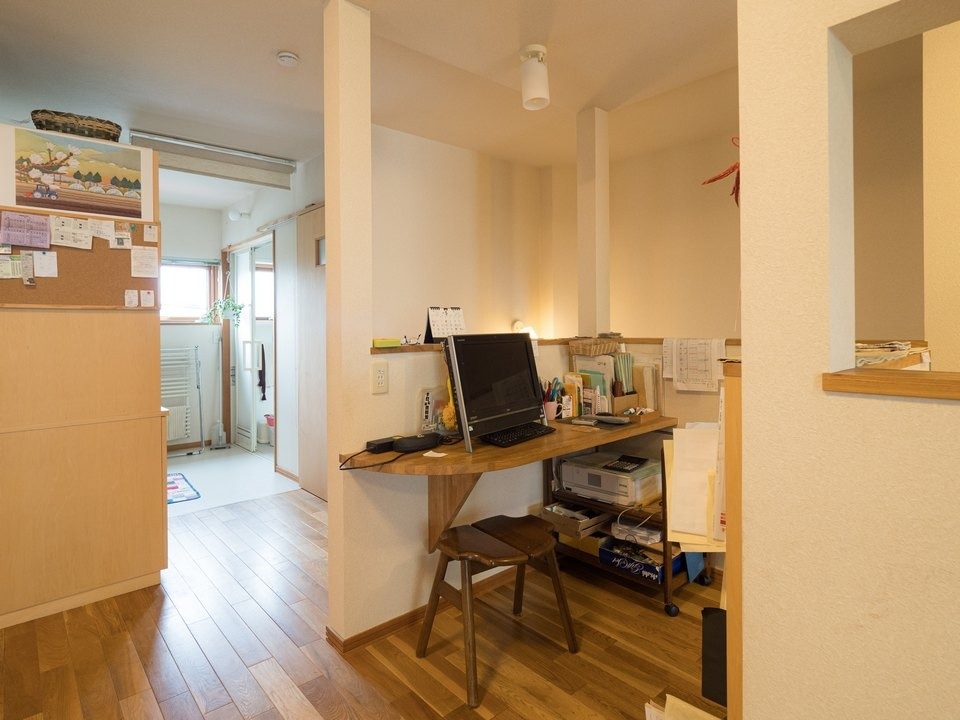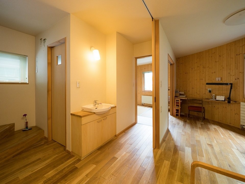 キッチンの隣はカウンターを造作した書斎コーナー。歳をとって身体機能が低下した時、大がかりな改修をしなくて済むようにエレベーターの設置場所として確保した空間でもあります。その奥の真っ直ぐな動線上にトイレ、洗面スペース、浴室を配置。「室内を移動する時、邪魔になる物がないから暮らしやすい。子供が走り回っても安心です(ご主人)」。
