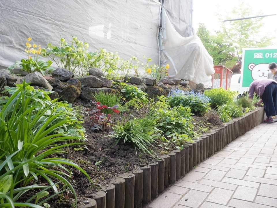 通りから敷地の奥へと、建物に沿って設けたお庭はプルーンの木やツツジを取り巻くように色とりどりの山野草が植えられ、新築時よりずっと賑やかになりました。