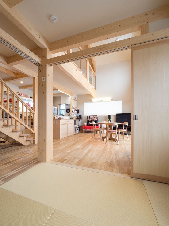 事例2も同じく東川で、海外→東京→東川に移住されたО邸でした。リビングはナラ無垢フローリングや珪藻土の塗り壁、木の柱・梁など、自然素材中心の優しい風合いで、窓からは庭と見渡す限りの田んぼ、そして大雪山系の山々が見渡せる家でした。