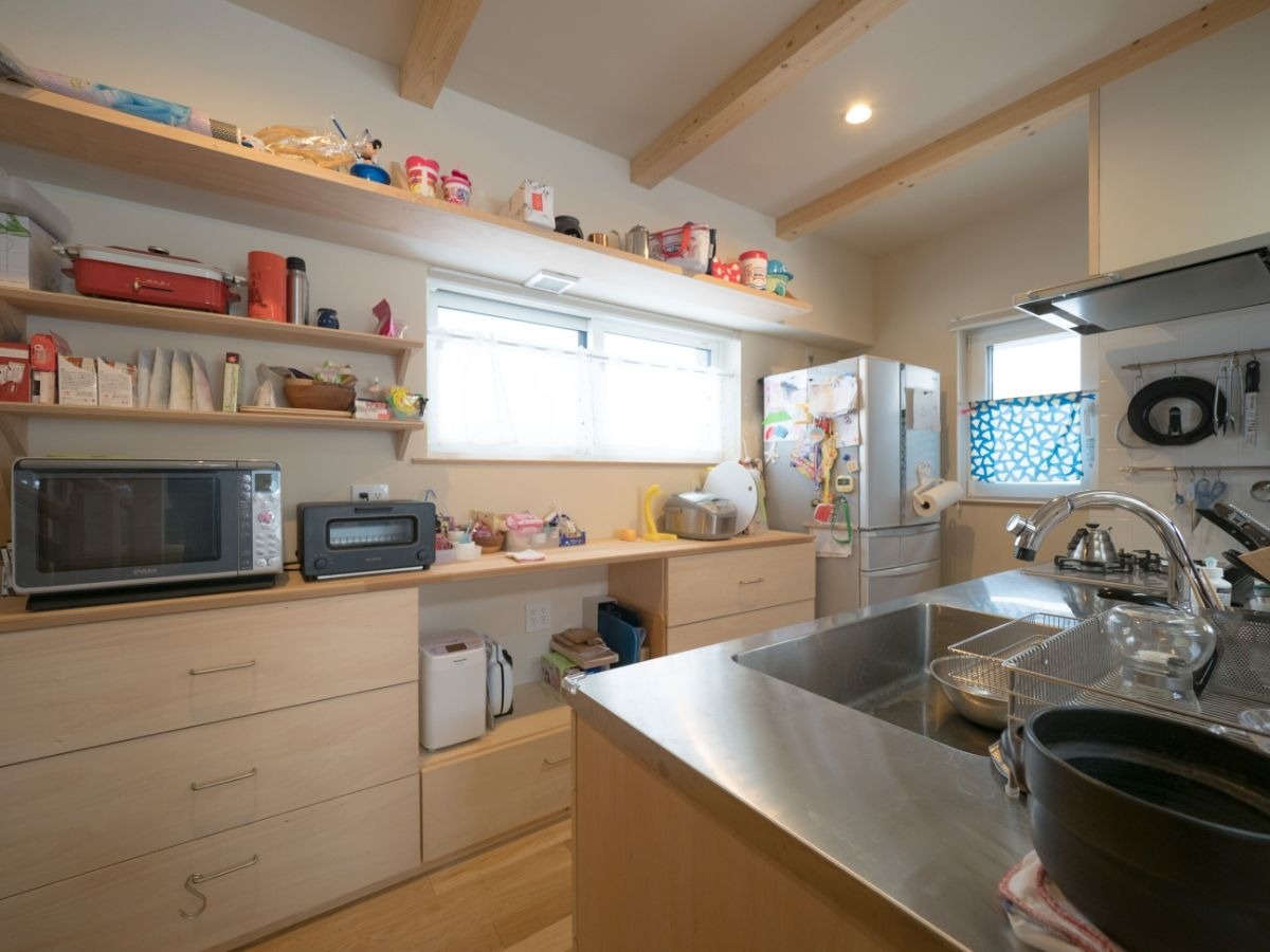 キッチンは対面で、面材の奥行と収納力を重視したので使いやすくなりました。外壁は全面板張りも魅力的ですが1階はモルタルの方が色の変化が少ないと考えました。