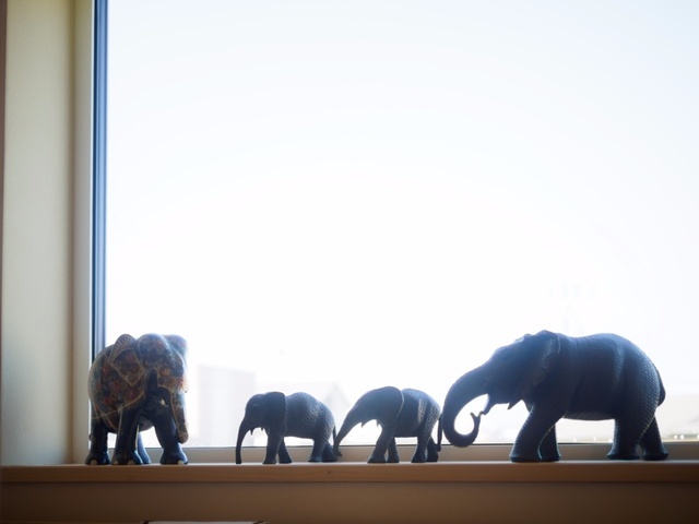 象の置物は、スチュワーデス時代に立ち寄ったケニアの露店で買ったもの。インドで買ったテーブルやカーペットも。お気に入りのものに囲まれた暮らしを楽しんでいます。