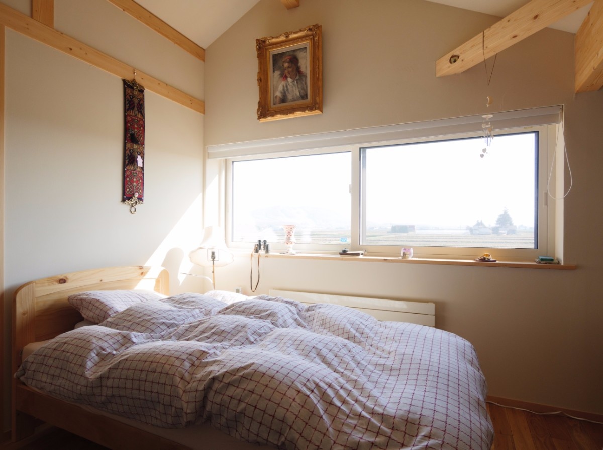 毎朝、目覚める度にベッドから遠くの山々や眼下に広がる田園風景を眺めます。天気が良ければ双眼鏡で鳥を探します。キタキツネが家の前を歩いているのを目撃することも。秋は山並みが赤みかかった紅葉に、冬は真っ白な雪山にスキー場のリフトがイルミネーションのように輝くそうです。