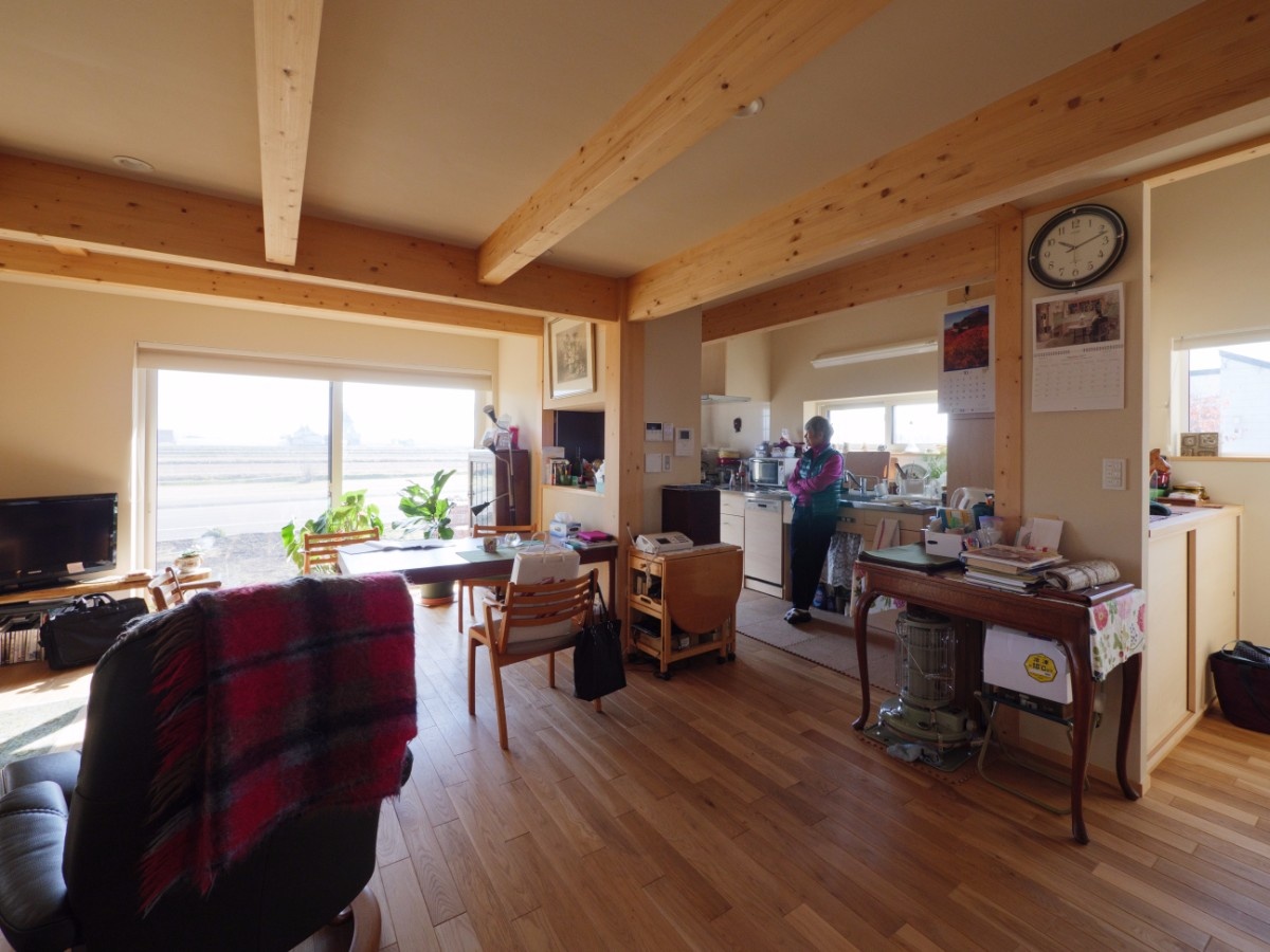 リビングはナラ無垢フローリングや珪藻土の塗り壁、木の柱・梁など、自然素材中心の優しい風合い。窓からは庭と見渡す限りの田んぼ、そして大雪山系の山々が見渡せます。