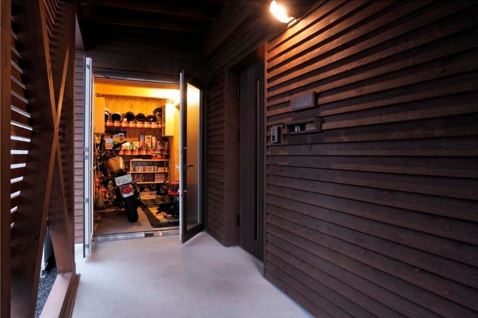 玄関スロープを進むと右手に玄関。そして正面には メタリックに輝くバイクとヘルメット、革ジャン、ブーツ。 М邸のご主人が大切にしているアイテムが一つの空間に揃うバイク部屋があります。