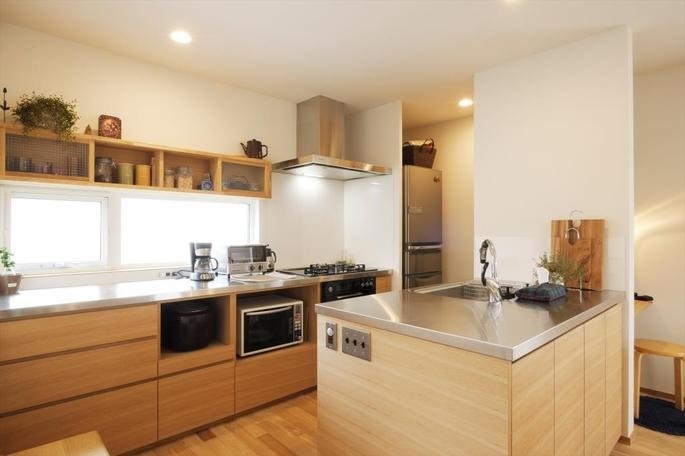 パンやお菓子づくりを楽しむ奥様のご希望に沿って設計されたキッチン。 パン発酵器をすっぽり納められる収納、お気に入りのカップを収納できる棚など、様々な要望に応えるためにキッチンまわりの収納や棚は全て大工さんの手作りです。 キッチンは1階の中心にあり、ダイニング、リビング、階段を見渡すことができます。