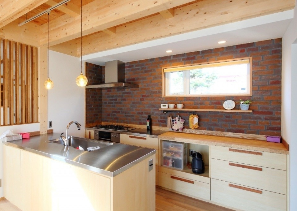 奥さま 「キッチンの壁は、ホクシン建設のモデルハウスを参考にレンガにしました。江別の米澤煉瓦にお邪魔して落ち着いた色合いのレンガを選びました。キッチンもオーダーで収納がたっぷりあります」