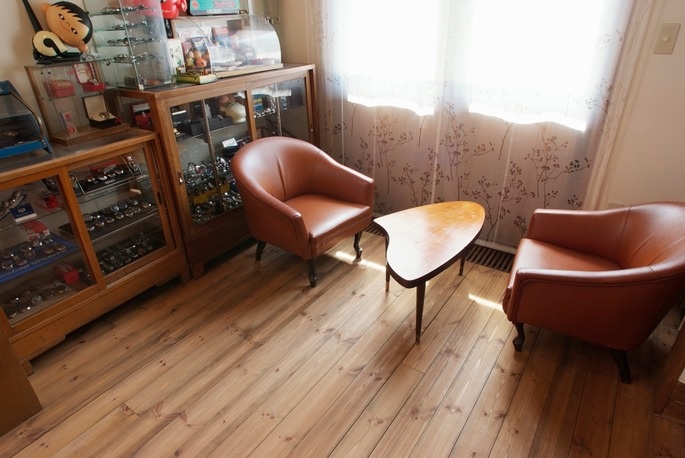 S邸を象徴するようなこのラウンジには、ご主人が集めたセイコー5SPORTSやオリエント時計など、昭和を代表する時計のコレクションが、まるで美術作品のように展示してあります。さらに、これらの時計が飾られる什器には、小さいころ文房具屋で見かけた絵具用のショーケースや薬やの陳列棚を利用。色や形も様々なモノが、しっくりこの空間に溶け込んでいるのは、Sさんの思惑通りだったようです。