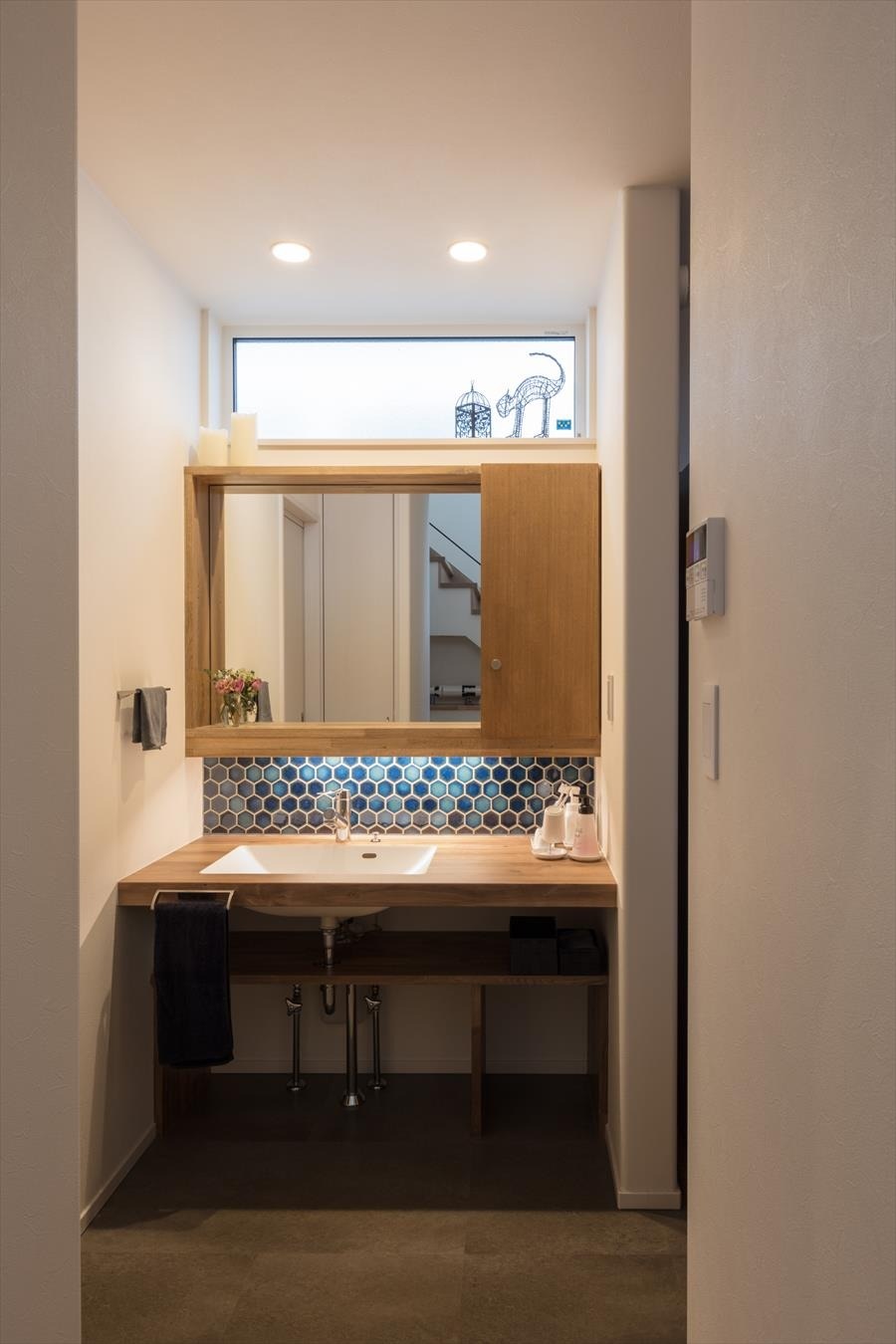洗面所はキッチンとつながっていて、その先には脱衣所とお風呂がありました。脱衣所は扉付きなので、ここでもプライバシーはしっかりと守られています。収納スペースもたっぷり。造作の洗面台はブルーのタイルが目に鮮やかで、さわやかな印象です。