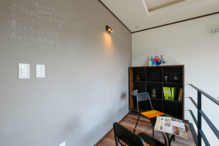 室内に入ると、1階は階段を中心にダイナミックな吹抜けがあるLDKと玄関、水回りを回遊できる動線とし、キッチン背面には豊富な収納を用意するなど、主婦の動きやすさ・使いやすさへのこだわりが感じられます。2階は洋室3部屋に加えて、書斎や子供の学習コーナー・プレイルームなど多目的に使えるギャラリーホール、将来的にはトイレにできるよう給排水管を接続可能にした納戸などを配置し、ライフスタイルの変化にも柔軟に対応。ギャラリーホールの壁はチョークで絵や文字を描くことができるなど、ちょっぴり遊び心も。