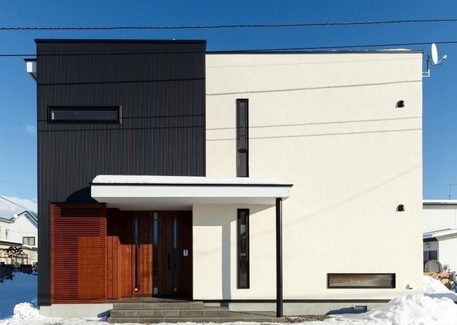 均整のとれたシャープな外観デザイン。木質の玄関ドアや格子が、全体のイメージにほどよい柔らかさを加えています。今回は、2017年末に完成した幕別町札内のT邸を取材させていただきました。