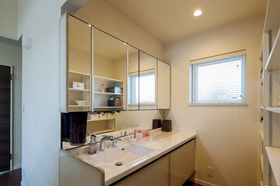 洗面スペースは、家族が3人並んで歯を磨けるほどの広さを確保。風呂やキッチンなど住設機器類は、朝日社長の案内で家族全員でメーカーショールームを訪れ、夫婦で話し合って好きなものを選びました。