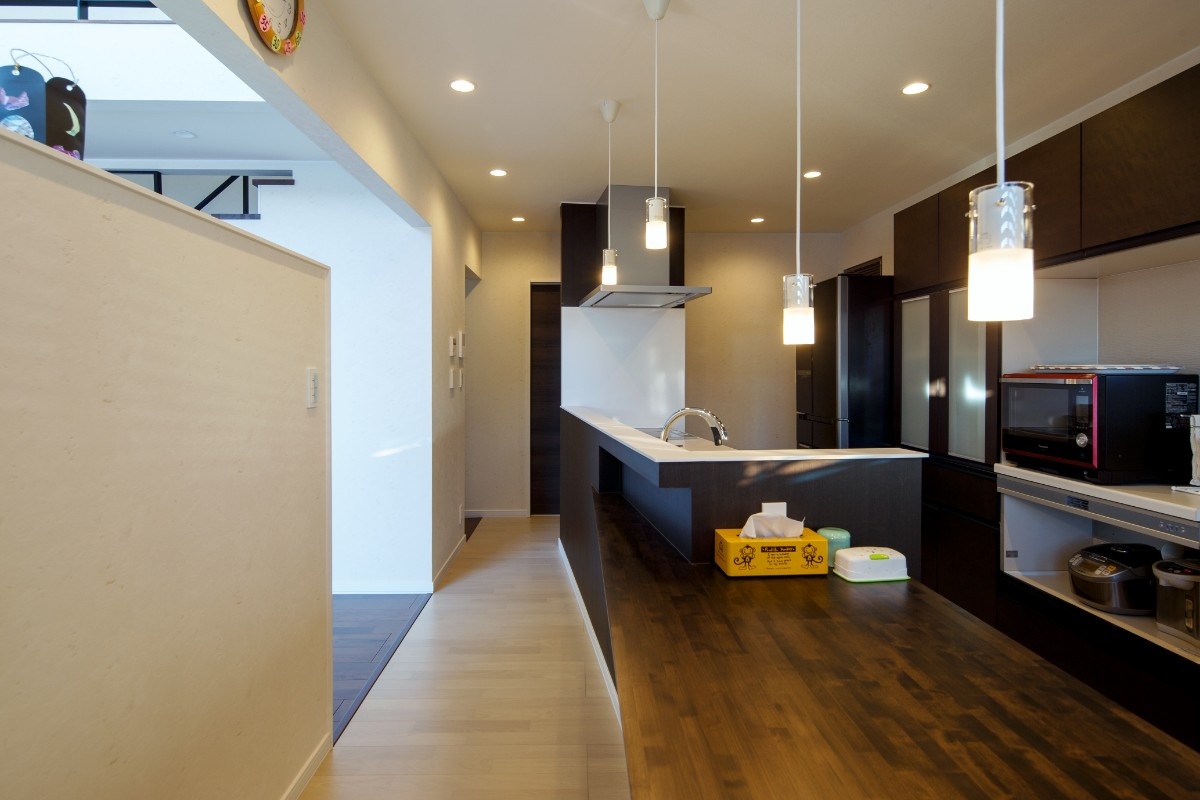ダイニングテーブルとキッチンは一体化。一直線ではなく若干角度を付けてデザインしました。お料理をしながら、リビングにいる家族の様子が見られる配置ですが、食事中に来客があったときなどに、リビングからはキッチン・ダイニングの様子がさりげなく隠れるという配慮もされています。