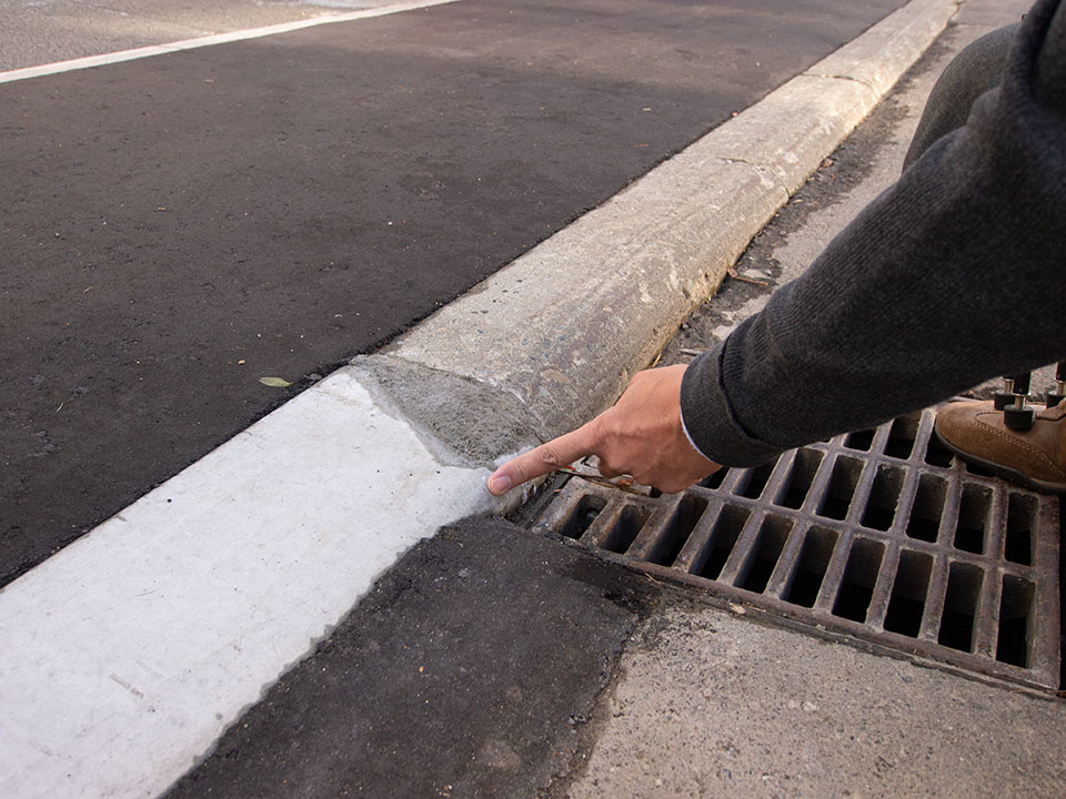 真新しい白いコンクリートが、段差をなくすために市道を改修した部分