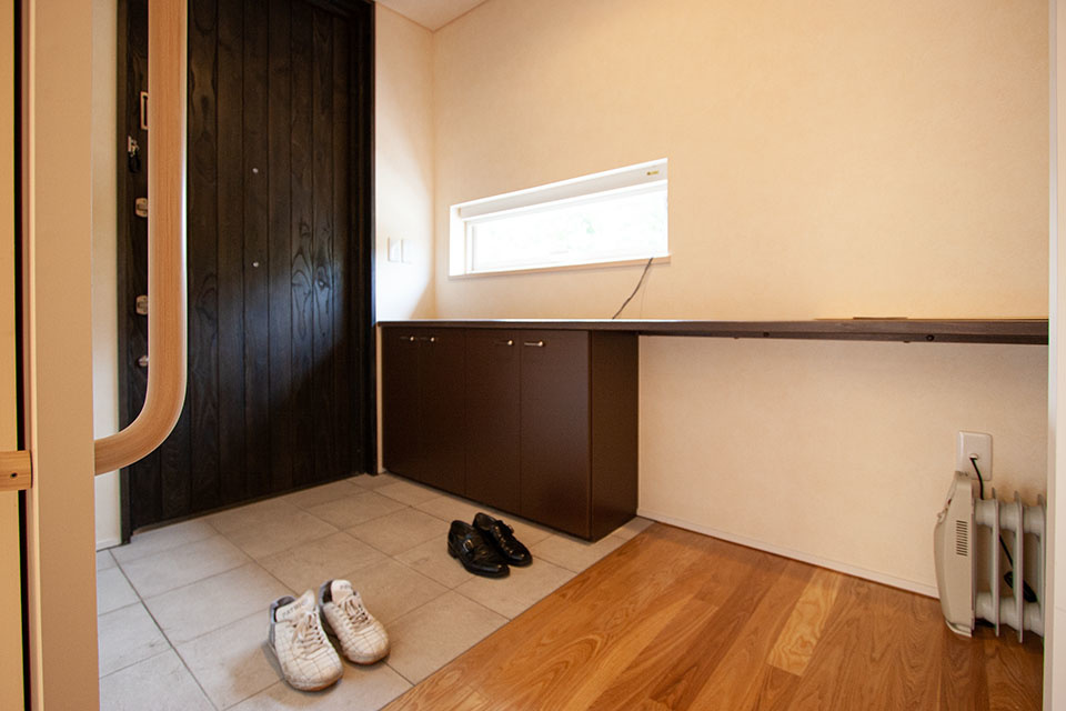 玄関カウンター下の空きスペースは、車いすで向きを変えるときにタイヤなどがぶつからない