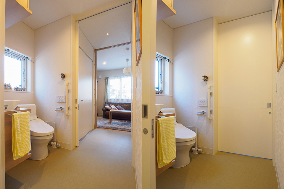 壁を取り払ってカーテンで仕切るトイレ、1/20勾配の緩やかなスロープで車椅子での外出を可能にした玄関周りなど、このときの経験がその後の住宅設計に生きています。