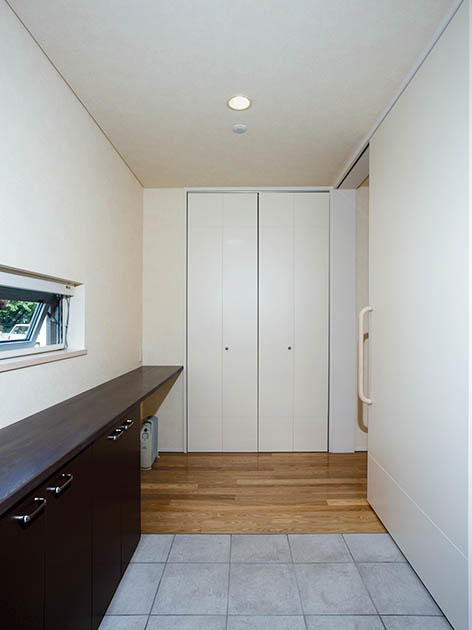 医療福祉の専門家である施主のAさんは海外生活が長く、障がい者の奥さまも不自由なく暮らしていました。ところが、帰国してから日本流のバリアフリー基準では、奥さまが大変暮らしにくいことに気づきます。日本にもバリアフリー基準や目安となる考え方はあります。たとえば「玄関と玄関ホールの段差を小さくする」とか、「廊下の幅を78cm以上取る」など、でも、高齢者や障がい者の身体の状態は一人一人大きく違います。教科書通りの対応では住みよい家にならないのです。それならば、家を建てて「実験住宅」として自分の考えを試したい。そんな気持ちに駆られました。
