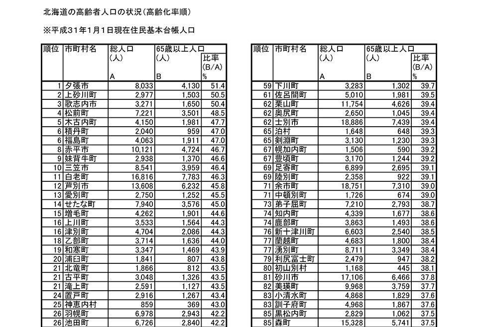 北海道が公表した資料より、道内市町村の高齢化比率ランキング。50%を超える自治体がある