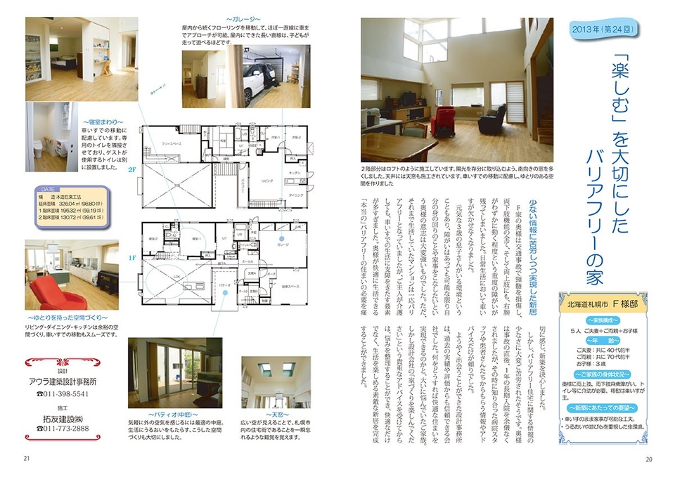 これまでのこのような取り組みが評価され、(公財)ノーマライゼーション住宅財団(土屋公三理事長)が、毎年募集している「バリアフリー建築助成」の中で、「今後の参考になる応募事例」の1つとして、アウラ建築事務所が設計したサスティナブルデザイン住宅の建築事例が選ばれ、事例集「ふれあい 総集編II」では、新築住宅18事例中に2事例が掲載されるほどになりました。
