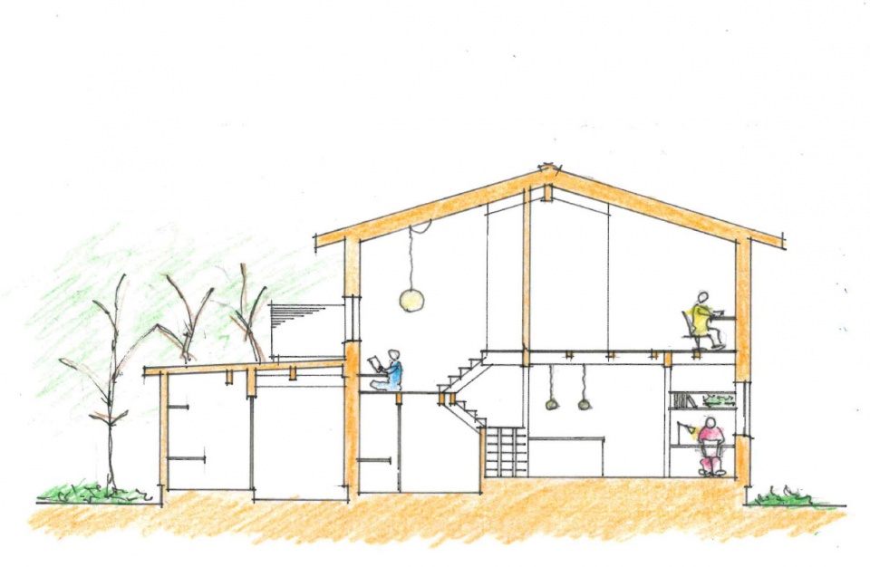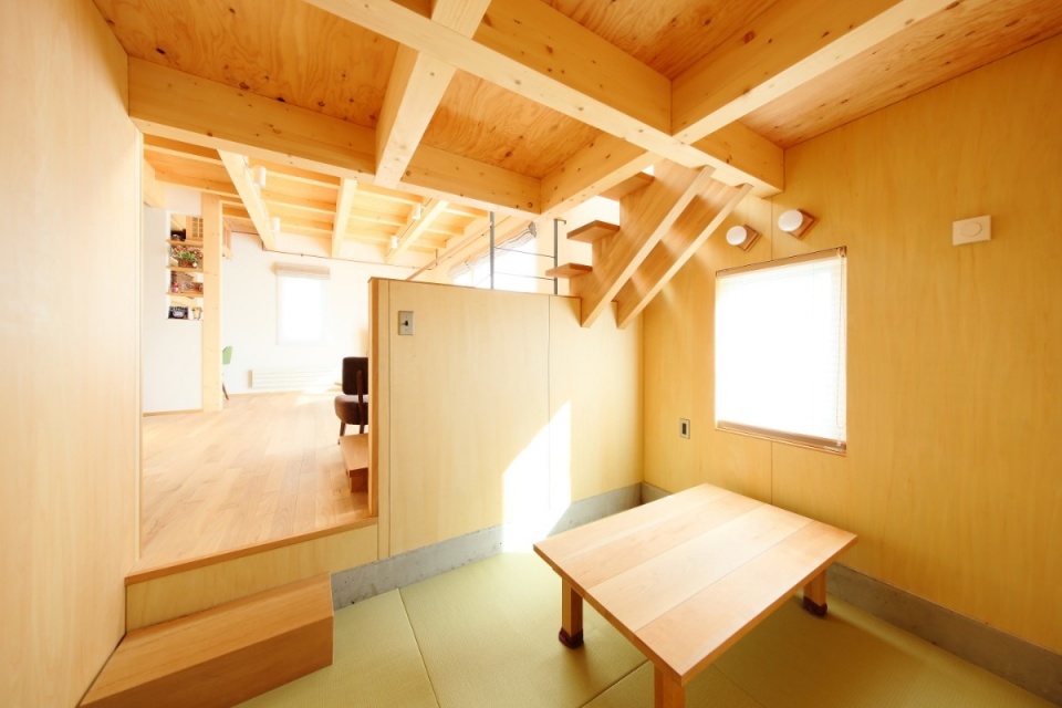 もう一つ、M夫妻がこだわったのがリビングより一段低い「隠れ家スペース」。スキップフロアの中2階「共有スペースの下を活用した空間です。ご主人の「居酒屋にあるような、あえてちょっと狭い空間が欲しい」という要望を踏まえた部屋です。「今朝も家族3人ここで朝食を食べました。開放的な家の中で唯一狭い部屋で、雰囲気が違って楽しいんです」とご主人。