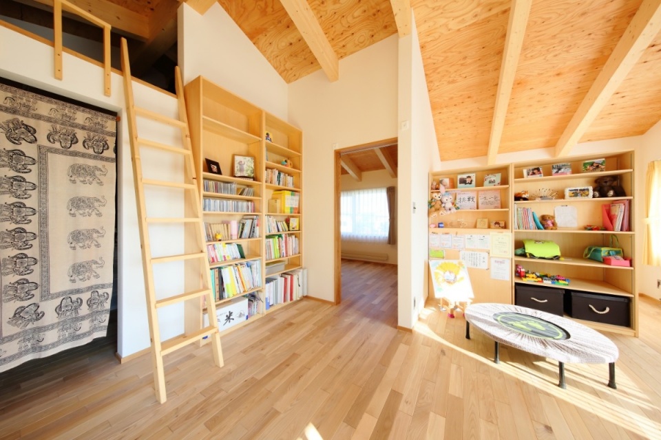 子ども部屋はドアで仕切られず、ワンフロアーにし、見渡せるように、右の本棚で空間をふたつに区切っています。奥様は「子どもが子ども部屋に籠もりきりになったりしないように、家族の様子がお互いに感じられる家にしたいと思ったんです」と話してくれました。