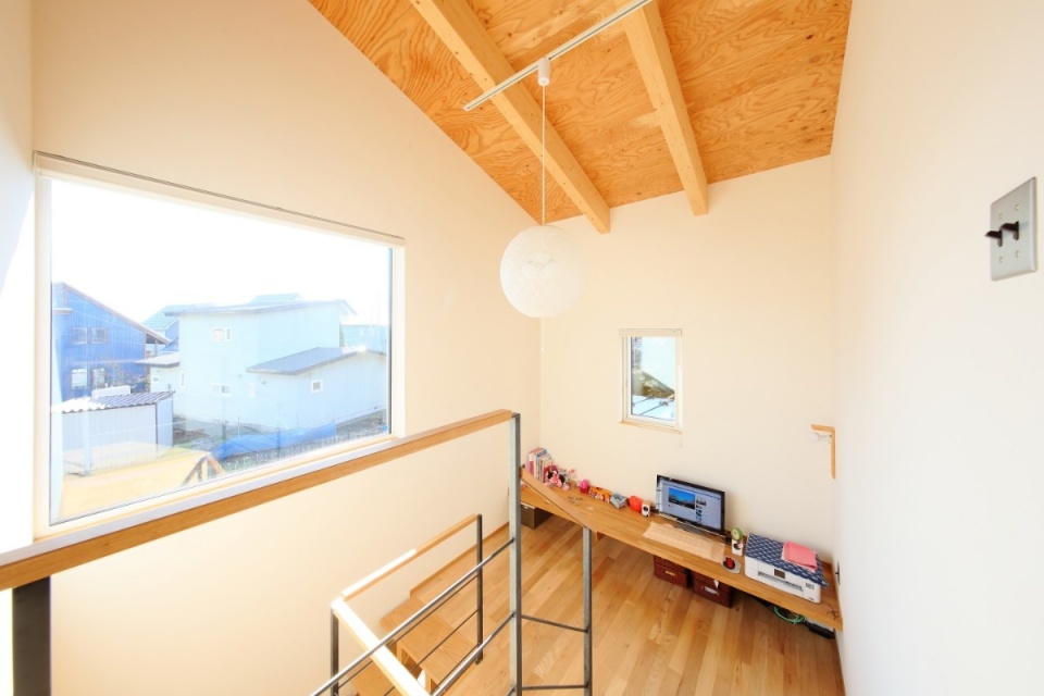 2階の天井は室内側から見ても三角屋根の小屋裏形状になっています。そのため2階の子ども部屋は開放感抜群です。