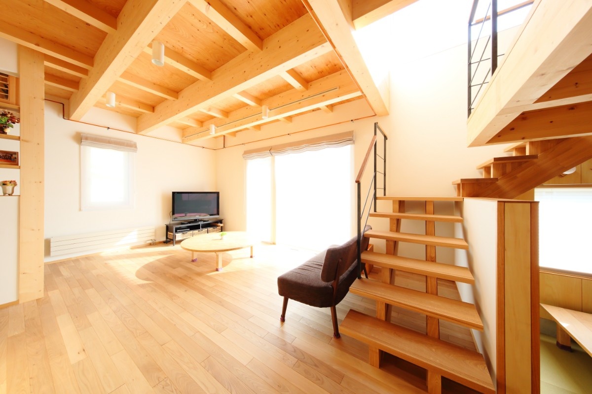 玄関を開けるとすぐ、リビングを中心とした開放的な空間が広がります。天井は梁が現しで、その分天井高も広がり、頭上の空間に体感的なゆとりがあります。