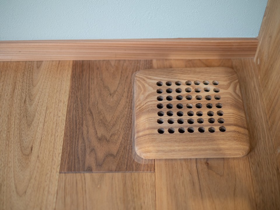 第3種換気システムを採用しています。こちらは2階居室の専用空気口。なんと造作による木製です。隅々までこだわりが感じられます。