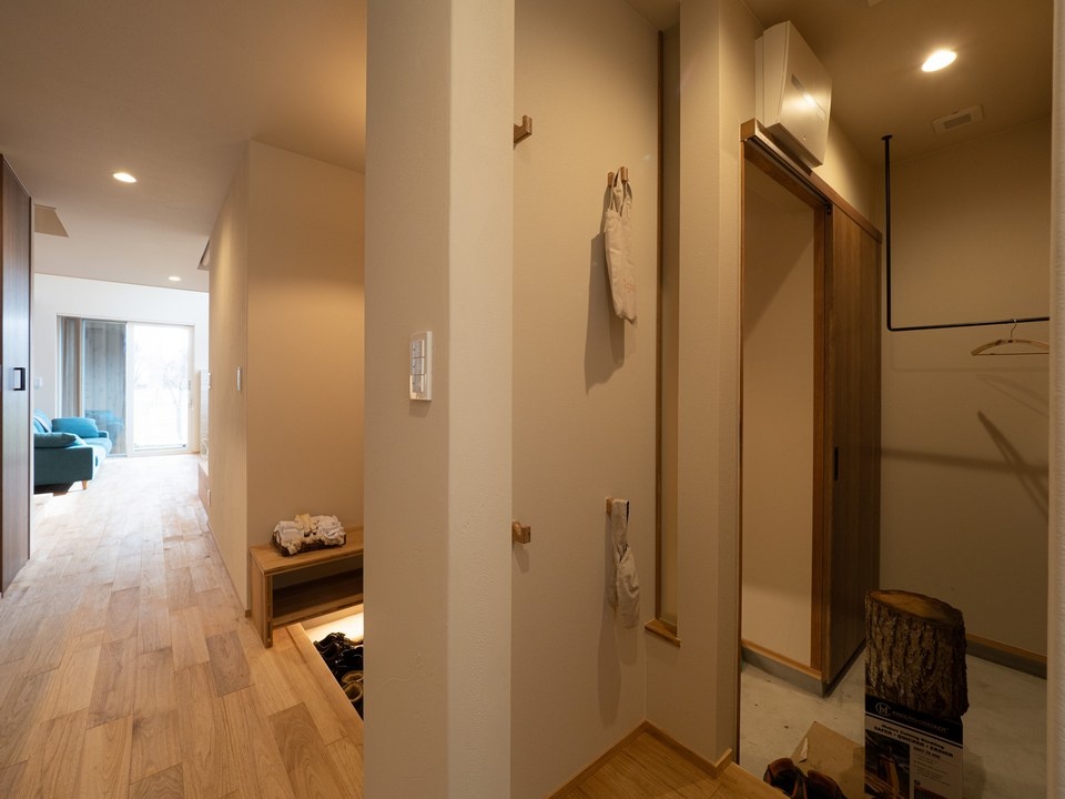 玄関にはシューズクローク(写真右手前)をプラン。リビングに続くホールは、約110㎝幅とゆったりサイズ。こちらも車椅子で十分に移動できる広さになっており、視界が広がることで空間全体に開放感をもたらしています。