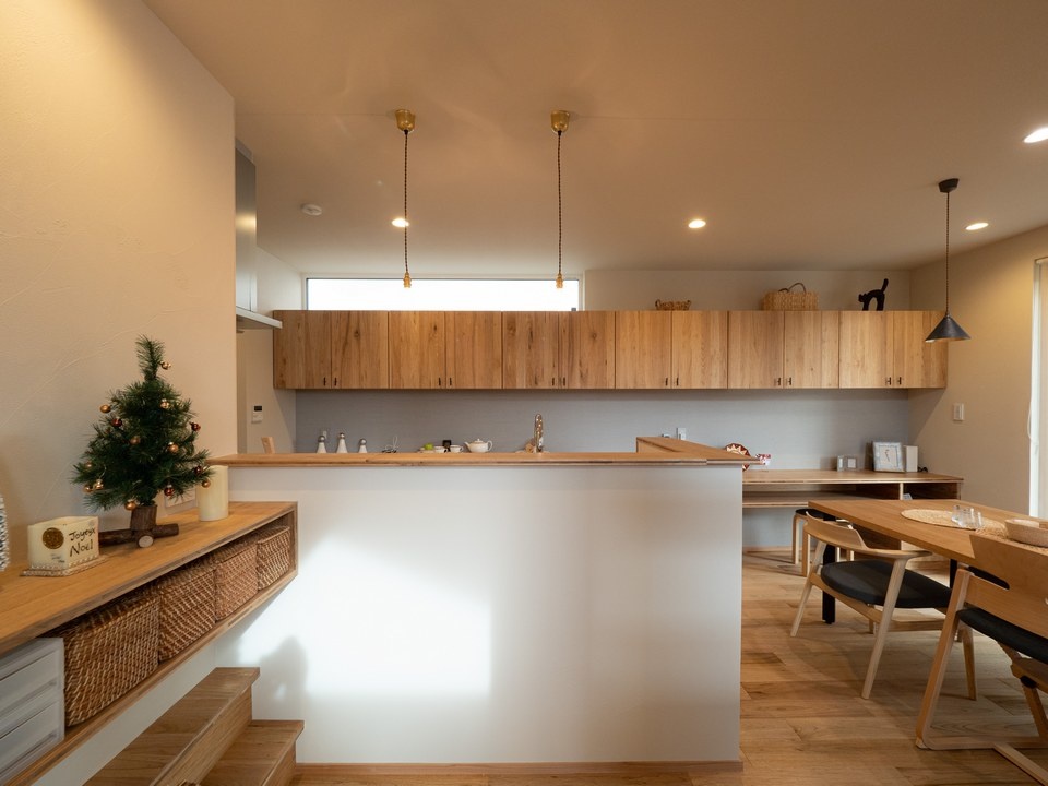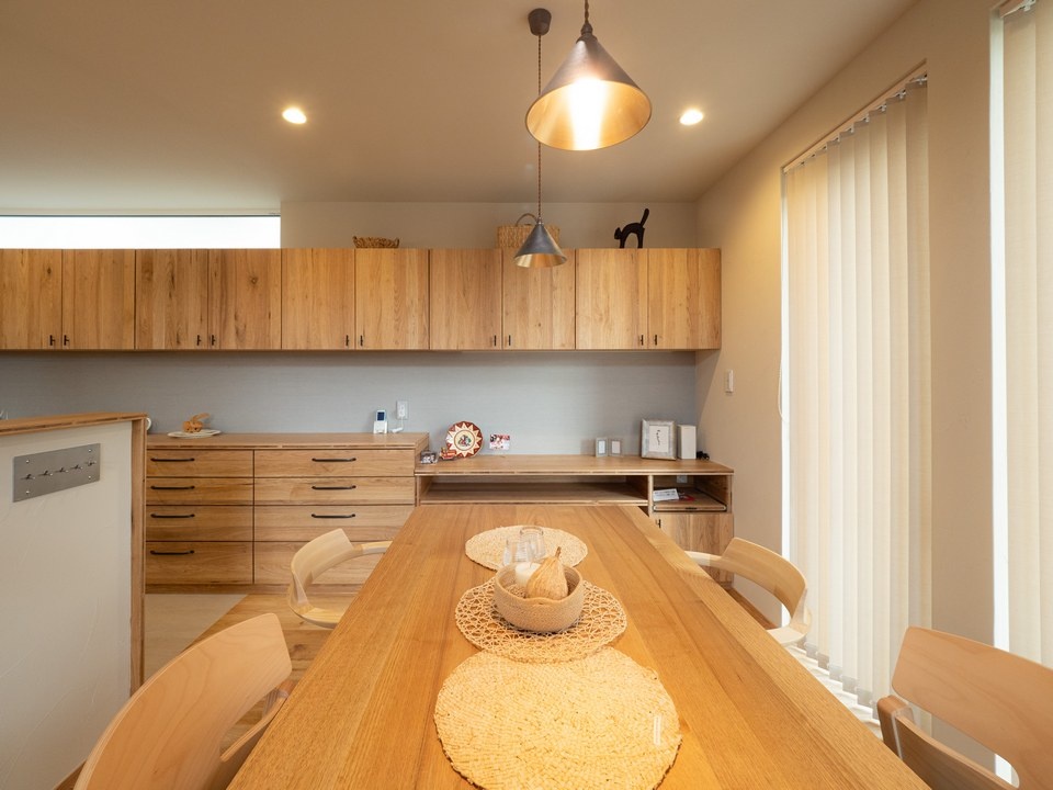 天然木で統一された心地よいダイニング・キッチン。幅5m以上におよぶ壁面収納は全てオリジナル。材料には高級家具などに使用されるクルミの三層材を使っています。