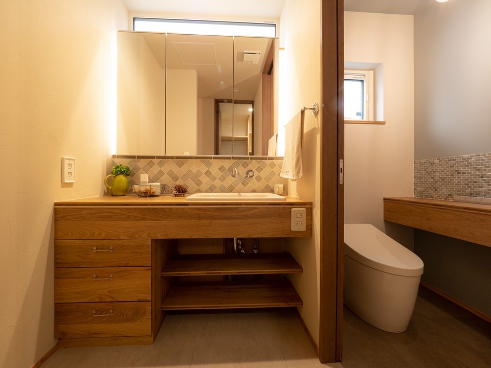 ファミリー玄関を出たところにある洗面化粧台。廊下から洗面・トイレまでは車椅子でもスムーズなように、ゆったりとしています。洗面もトイレも、シックなタイルが印象的です。