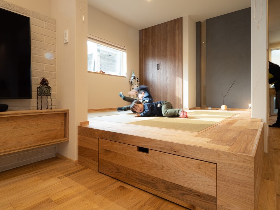 リビングと一体化した畳コーナーは小上がりタイプ。下部は引き出し式の収納が付いています。