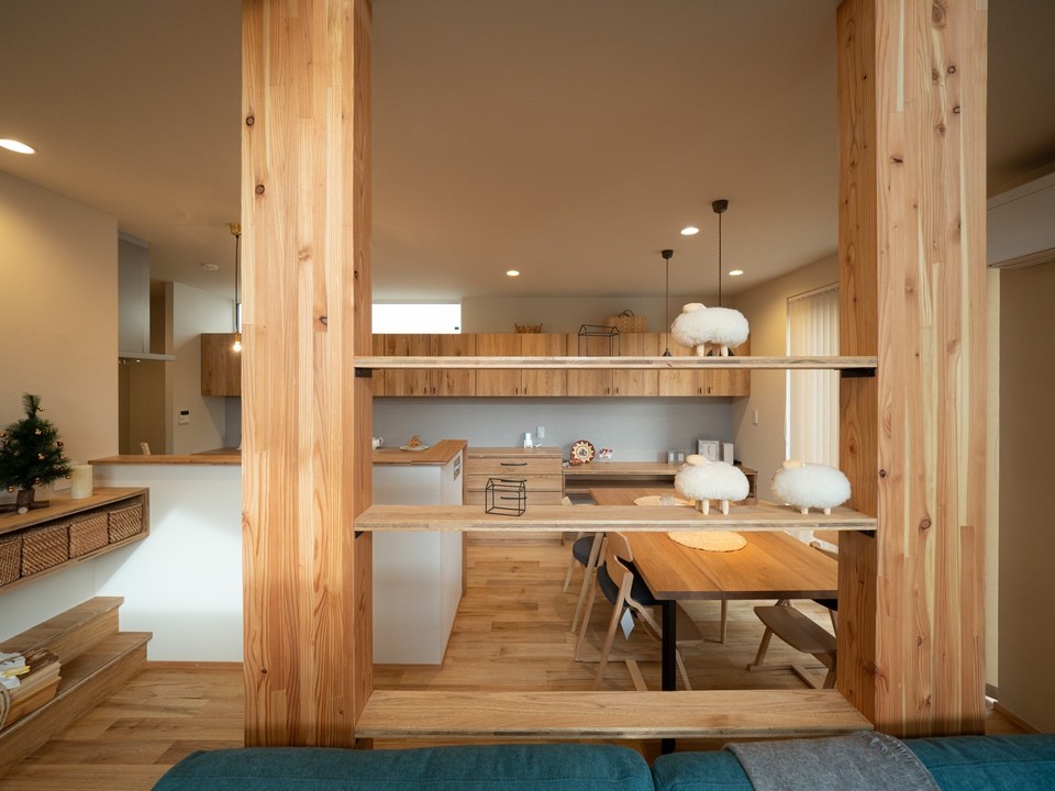太さ12㎝×24㎝の構造柱を現しにして、三層板を渡したシェルフ。ダイニングとリビングの自然な間仕切りにもなって、良い雰囲気。視線が通るので、キッチンに立っていてもリビングの様子を見渡すことができます。
