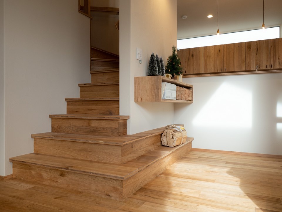 リビング階段の下段1、2段目は壁を囲むようにつくられており、空間に広がりを感じさせます。
