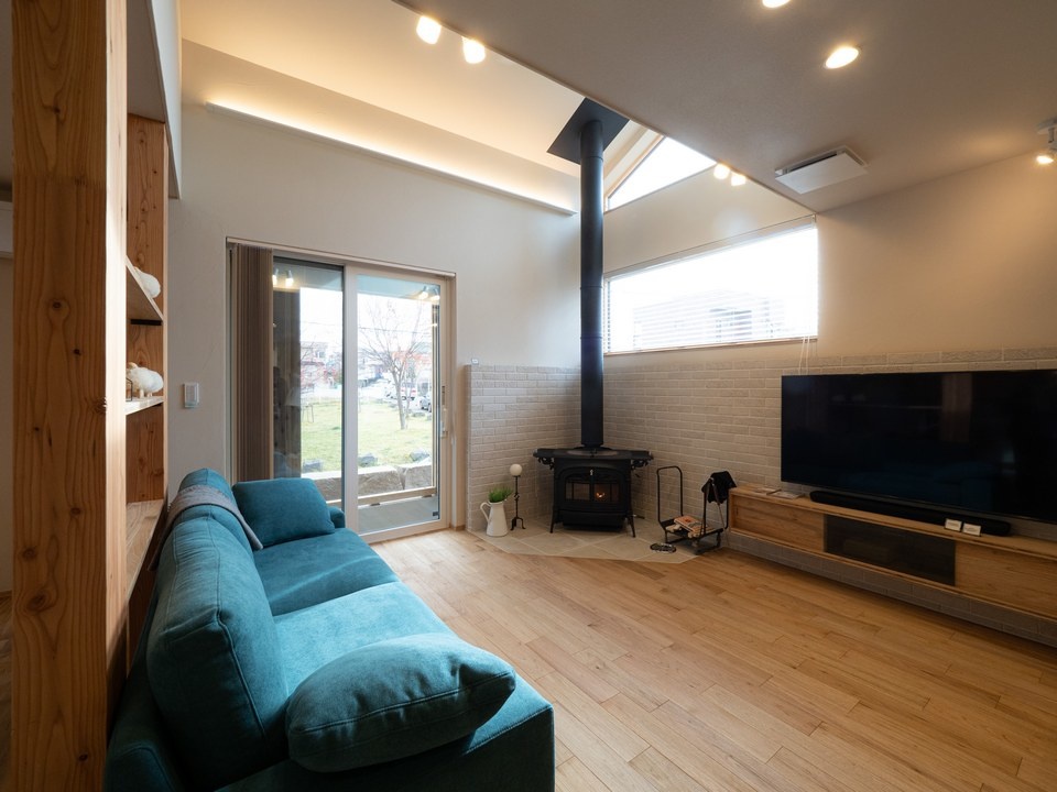 勾配屋根の一部を吹抜けにしたリビング。クルミの無垢フローリングが足裏に心地良く、吹抜け窓や高窓から日差しが降り注ぐ寛ぎの空間です。