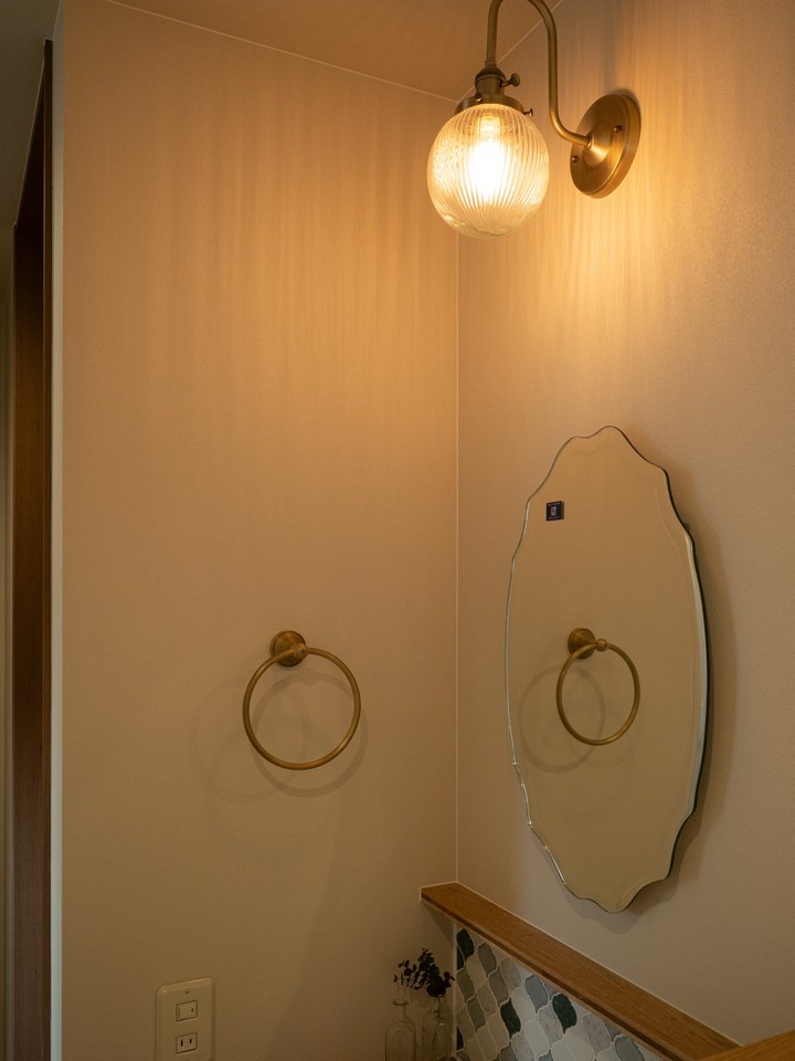 好みの壁紙をネットで見つけ、コーディネーターの篠崎正子さんに画像を渡すと、期待以上の商品を探して提案してくれました。2階の洗面化粧台は、名古屋モザイクや真鍮の蛇口、アンティーク調のランプなど、室内インテリアにもマッチしており、特に気に入っています。