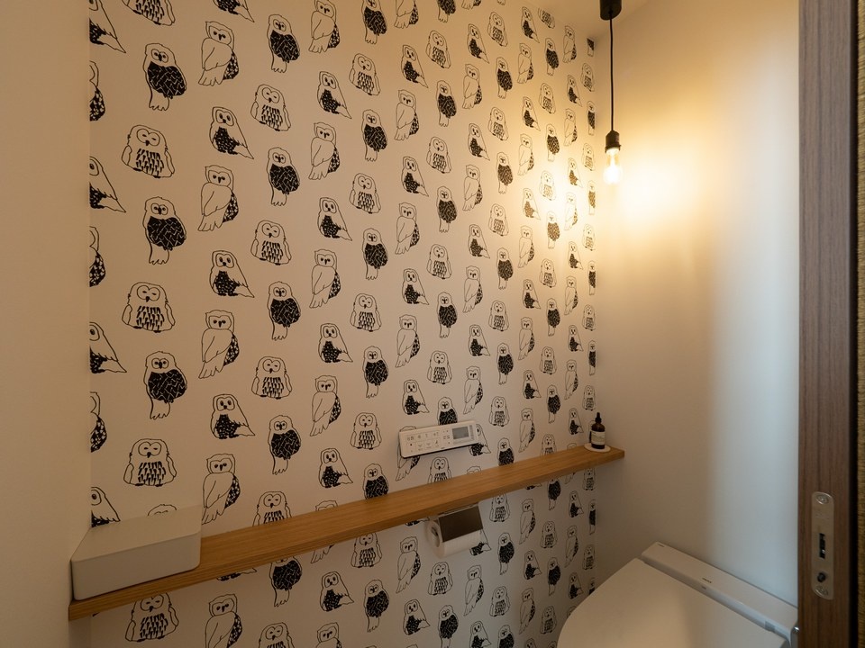 室内は開放的に使いたいと考えているEさんご夫妻。玄関入ってすぐのトイレは、普段は引き戸を開けていて、フクロウをモチーフにした壁紙を見せています。