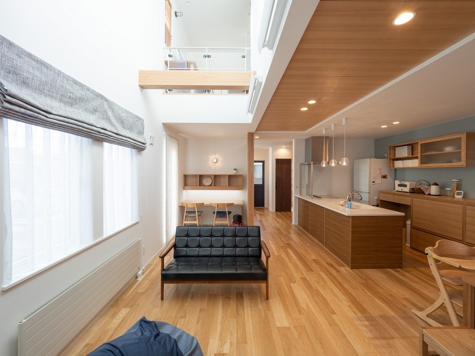 Eさん邸はナラ材の無垢フローリングを採用。天井の突き板張りや吹き抜けの化粧梁などウッディに。壁はホワイトを基本に北欧テイストのグレーやブルーを効果的に使っている