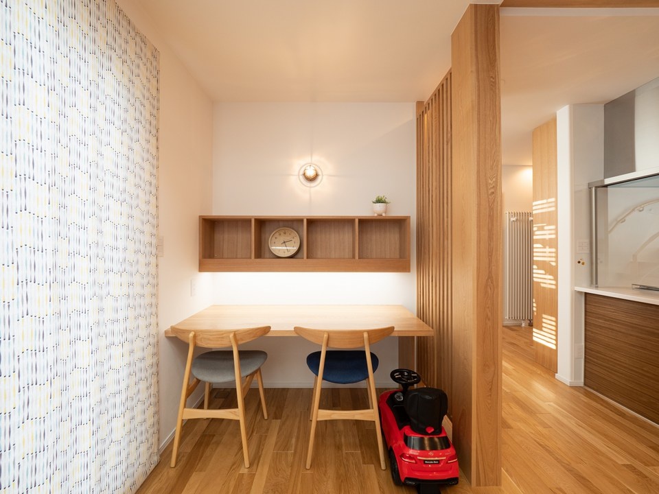 キッチンカウンターの向かいには、勉強用のカウンターと棚を造作しました。前の住まいで使っていたNOCE(ノーチェ)のチェアとも調和しています。お子さんの様子がそれとなく分かるように、玄関からの目かくしも兼ねてキッチンとの間には木製ルーバーを設けました。
