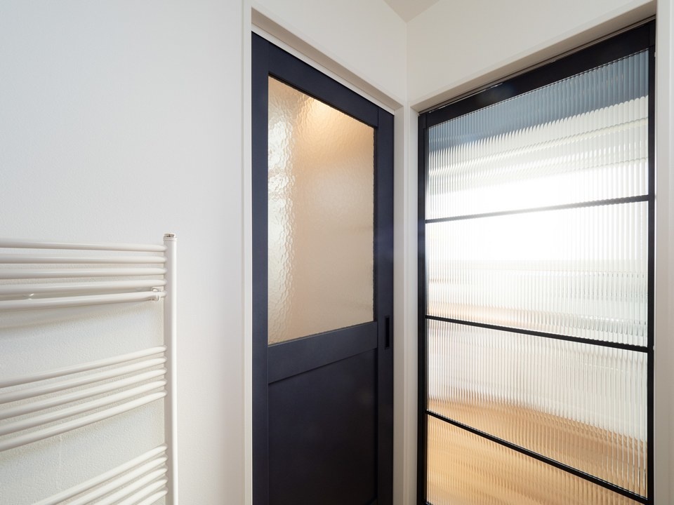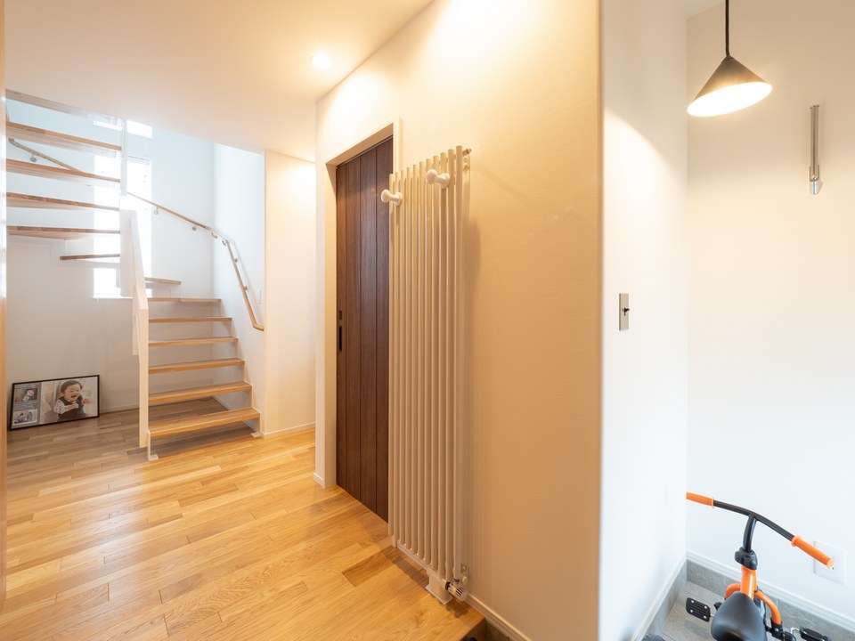 洗面脱衣室のドアは2つあり、右側はランドリールーム、左側は玄関・階段・LDKの3方向に続くホールにつながっています。「ホールや玄関も含めて、家全体が暖かいですね」とEさんご夫妻。取材に伺ったのは11月初めで屋外では寒さを感じましたが、室内は程よい暖かさでした。「今は暖房も付けていません。朝晩に入れる程度です」