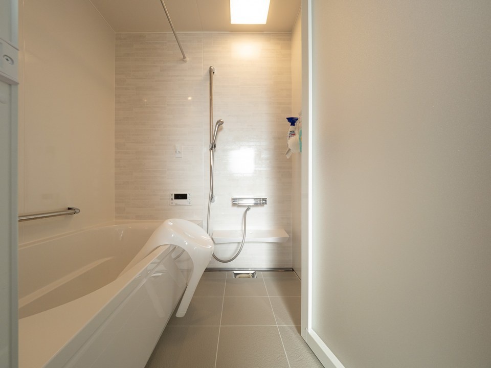 ランドリールームからは洗面脱衣室、バスルームと一直線につながっています。「お風呂を出たら、ランドリーから下着や部屋着を取って着替えます。脱いである分はその場でまとめてお洗濯。ひと続きなのでとてもラクですよ」