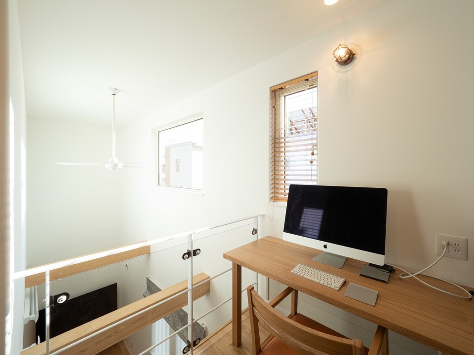 ご主人の書斎スペース。2階には、このほかウォークインクローゼット付きの寝室と2つの個室、トイレを設けています。「収納は多めに設けました。それも、隠す収納と見せる収納を分けているので家がすっきりとしていますし、来客時も安心です」