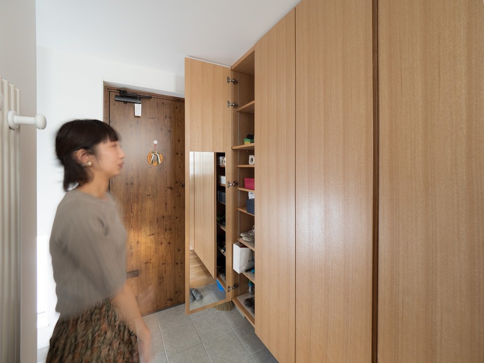 玄関の造作クローゼットは2棹(さお)分を確保。内部に取り付けたスライド式のコートハンガーは、ハンガー部分を手前に引き出せるタイプで出し入れがスムーズ。身だしなみをチェックできる鏡も付けています。