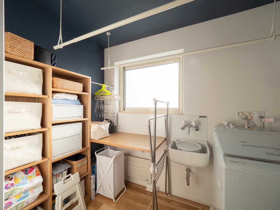 奥さまがもっとも気に入っているのが、一室で洗濯作業を済ませる“時短”のランドリールーム。右から洗濯機、部分洗いや浸けおきができる多目的流し(SKシンク)、たたみやアイロンができる作業台、下着や部屋着をしまう収納棚。天井には物干しを設置してあります。「窓があるので日差しが暖かいし、洗濯物もよく乾くんですよ」と奥さま。