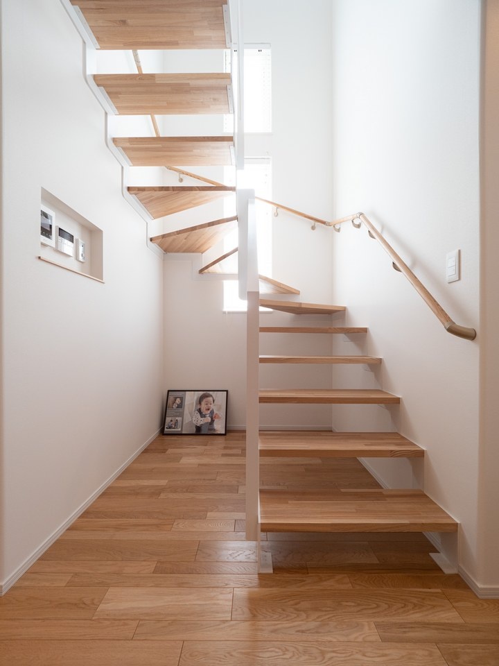 白を基調にした軽やかなオープン階段。縦長の窓を上下に連ねて明るい光を採り入れました。鋼製のオープン階段は大工さん泣かせとも言えるつくりですが、「私が図面に描いたものを、現場担当者が大工さんと打ち合わせを重ねてくれて、毎回思っていた以上にきっちりときれいにおさめてくれるんです」と林さん。