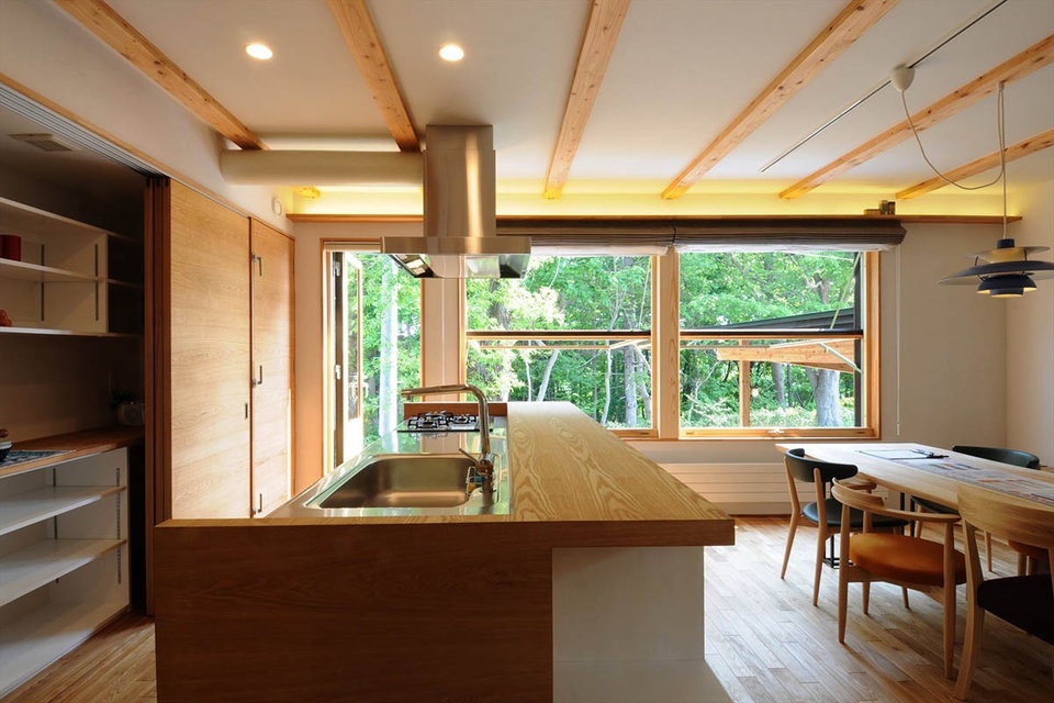 創業から67年後の1985年にコンクリート住宅の外断熱工法で、室蘭工業大学・鎌田紀彦研究室(当時)らによる実験住宅の施工を担当し、その後木造住宅を再開したのは、鎌田教授が開発した新在来木造構法にいち早く取り組み、結露やスガモリといった悩みから解放された、あたたかくてオープンな間取りをつくることができる木造住宅の技術を習得したからでした。