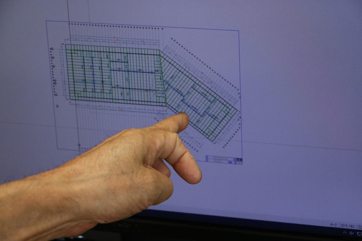 難しい案件を一手に引き受けるのは、棟梁統括の杉山勝朗さんです。同社の設計はこう配屋根を中心に60度でも30度でもない複雑な角度がからむ設計が少なくないそう。そういった住宅を大工が現場でスムーズに工事できるように、パソコン上で木材の加工図面を書いているのが杉山さんです。現場仕事は数年前に卒業しましたが、70歳にしてパソコンで図面に向かっています。「加工図を数点書いてあげれば、工場はわかってくれる」と杉山さん。設計と工事をつなぐかなめの仕事を楽しそうにこなします。